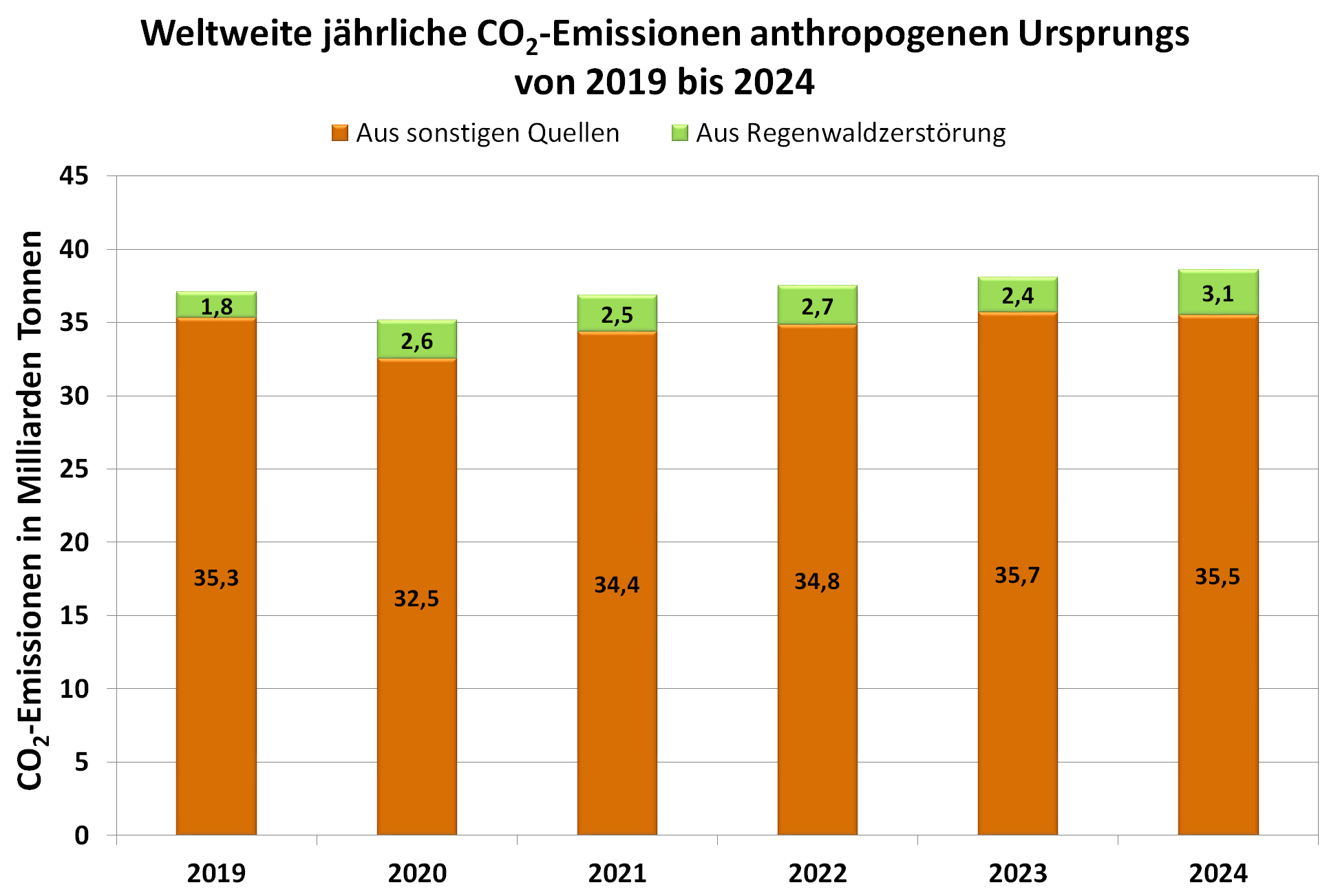Die Brandrodung der tropischen Regenwälder trägt zu den vom Menschen verursachten CO2-Emissionen bei. Im Jahr 2024 wurden weltweit 38,6 Milliarden Tonnen (Gigatonnen oder kurz Gt) vom Menschen verursachtes CO2 in die Erdatmosphäre freigesetzt. Dieser Wert blieb in den vergangen sechs Jahre relativ konstant, mit einer kleinen Delle im Jahr 2020 wegen der Corona-Pandemie. Von den 38,6 Milliarden Tonnen im Jahr 2024 gingen 3,1 Milliarden Tonnen auf die Brandrodung der tropischen Regenwälder zurück, das entspricht 8 %.
